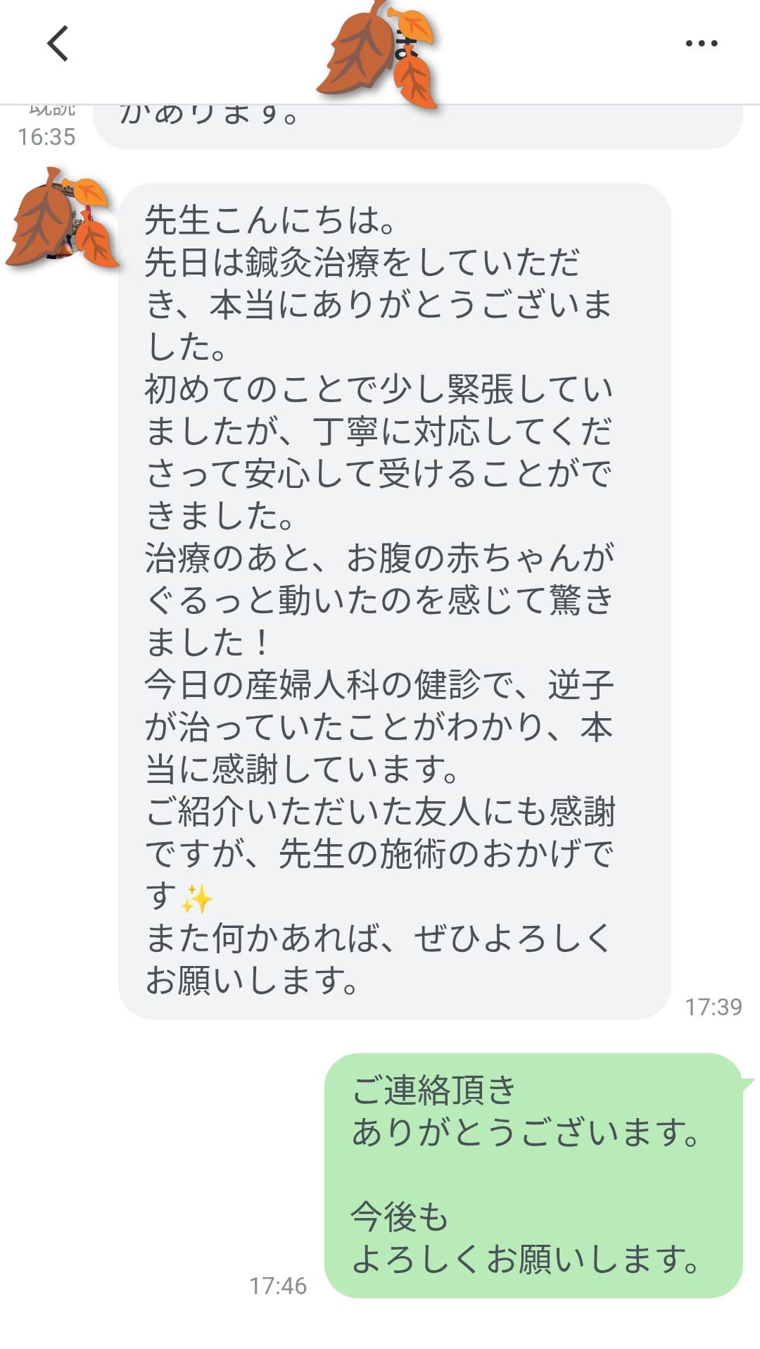 2週間後の妊婦健診では無事に逆子が治っていたとのご報告をいただきました。